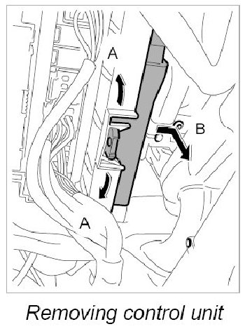 1. Push the two locking tabs apart -arrows A-. Pull the control unit to the right and downwards -arrow B-.