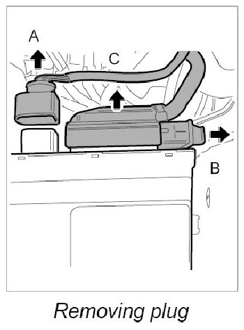2. Press and pull off plug -arrow A-. Open lock -arrow B- on plug -arrow C- and remove plug.