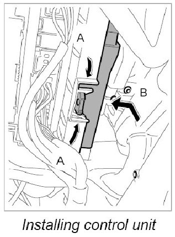 3. Insert control unit into the upper mounting point -arrow B- and engage in holder -arrows A-.
