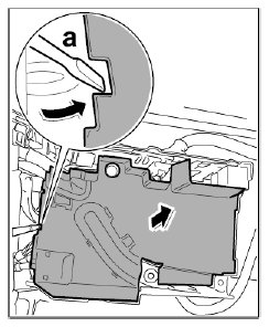 9. Lever off lid from power distributor with a screwdriver -a- and remove -arrow-.