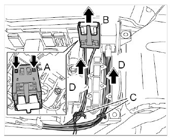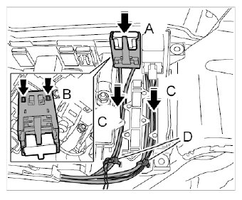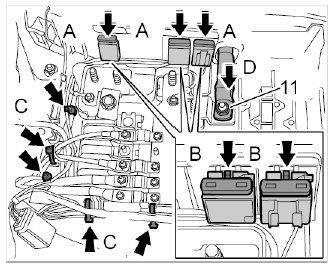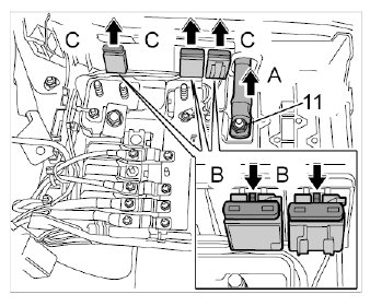 26. Release fuse carrier -Arrow B- and remove it from brackets -Arrows C-.
