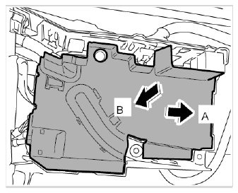 21. Push in cover of power distributor from front to back -Arrow A- and press on -Arrow B- until the latch engages.