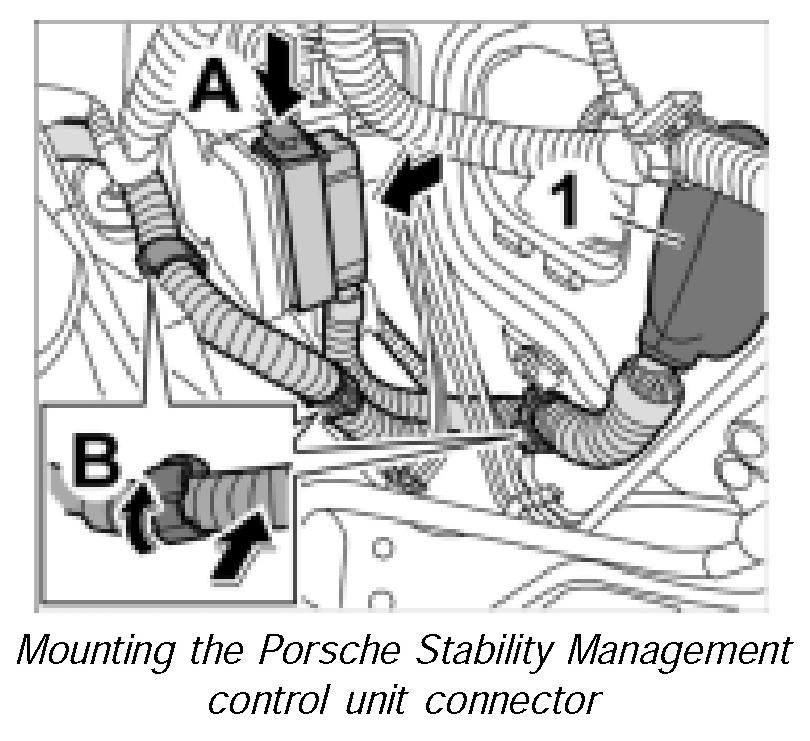25. Mount cap on Porsche Stability Management control unit connector until this is felt to engage.