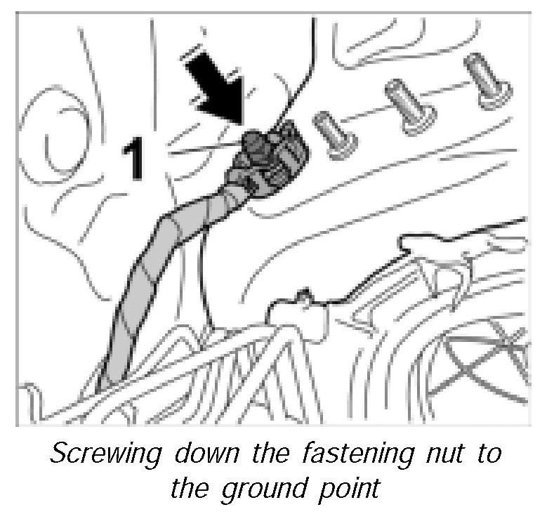 30. Mount ground strap together with the twist lock on the stud and screw down with the fastening nut -1-. Tightening torque 6.5 ftlb.