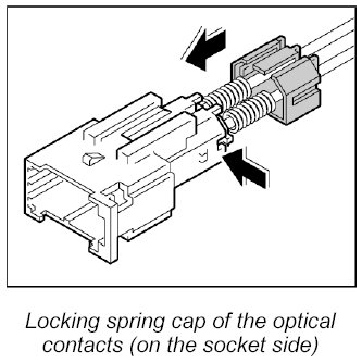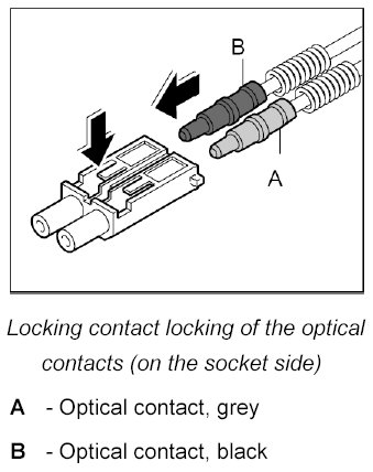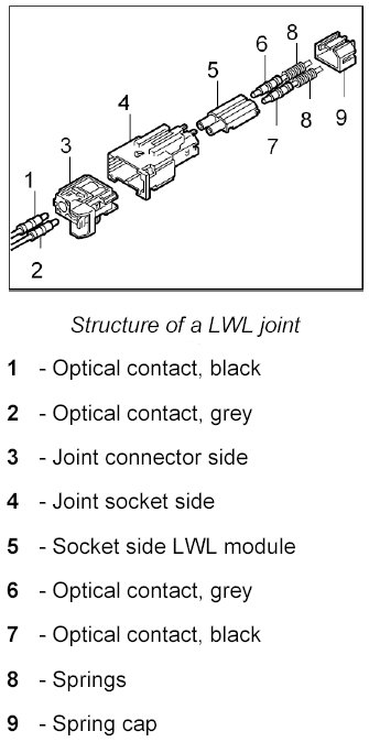 The LWL is delivered with affixed plastic contacts. These contacts are latched in the connector housing in the case of repairs. Grey and black contacts with identical mechanical dimensions are used.