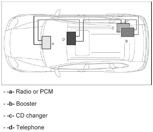 In all MOST control units, at least one sending diode and one receiver diode are installed. The sending diode of a MOST device is connected to a receiver diode of a 2nd MOST device. This results in a ring where the light signal is reinforced in each control unit (in each control unit, the light signal is transformed into an electrical signal).