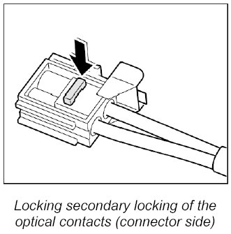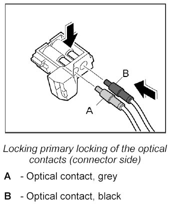 The LWL and the plug connections must not come into contact with fluids such as water, creeping compound, preservative, anti-freeze protection, cleaning agent. They will impair the MOST system function or cause complete system failure. Even plug connectors with plugged-in protective caps must not come into contact with the fluids listed.