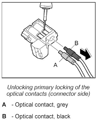 1. Release the connectors of the damaged optical waveguides on the affected components -Arrow a- and disconnect them. The illustration shows the connector on the CD changer as an example.