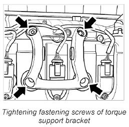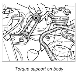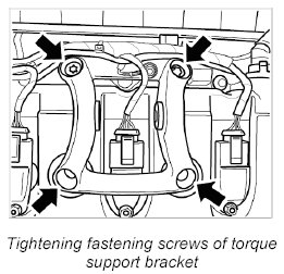 1. Install bracket for the torque support. The M8 x 45 Torx screws are tightened at the upper screw points. - Tightening torque: 23 ftlb. At the lower screw-mounting points (centre of valve cover) the M6 x 40 are first tightened to - Initial tightening: 3.5 ftlb. and then to - Final tightening: 7.5 ftlb.