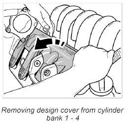2. Remove design cover of cylinder bank 5 - 8. To do this, lift the cover slightly with both hands at the edge pointing towards the intake system until it is released from its holder.