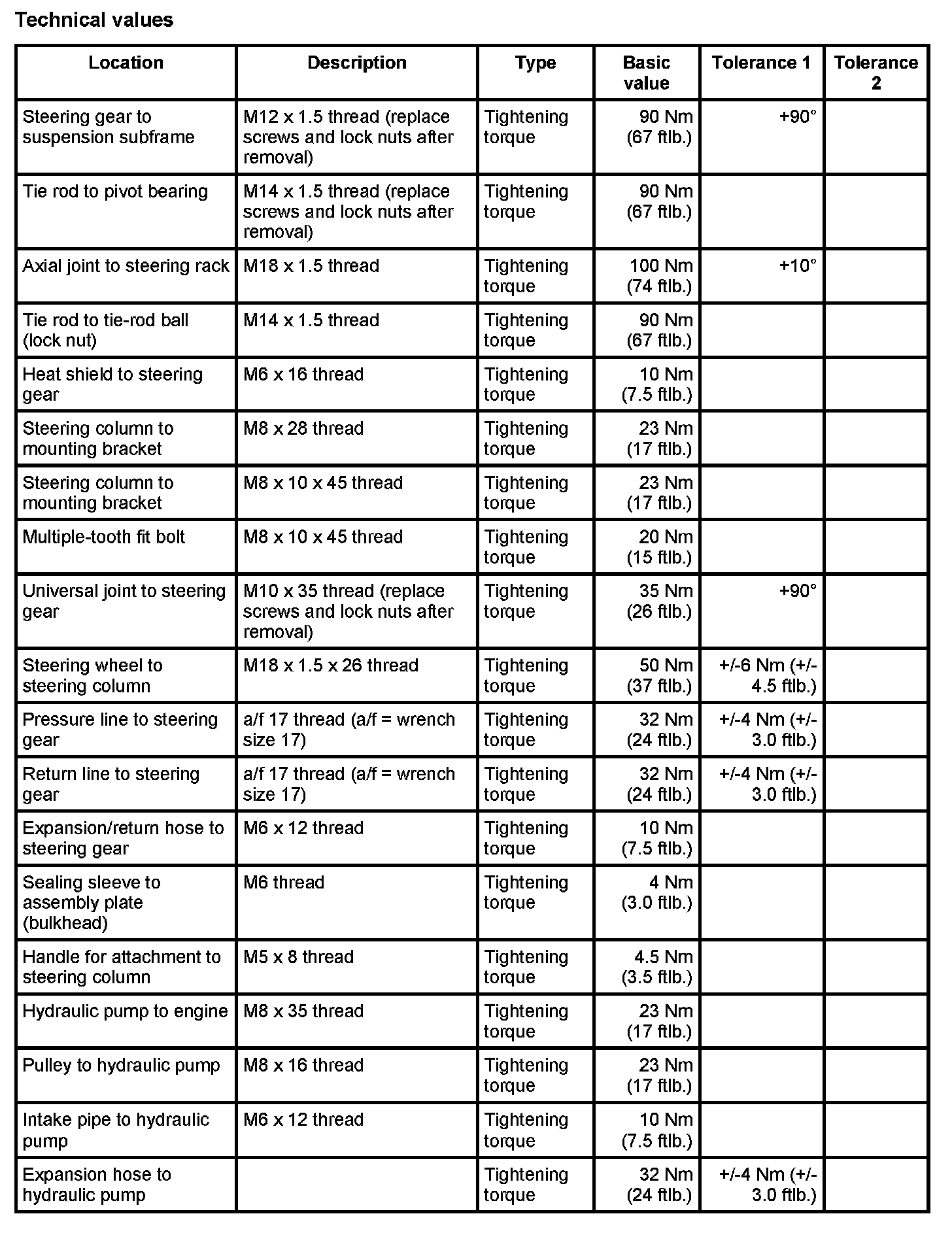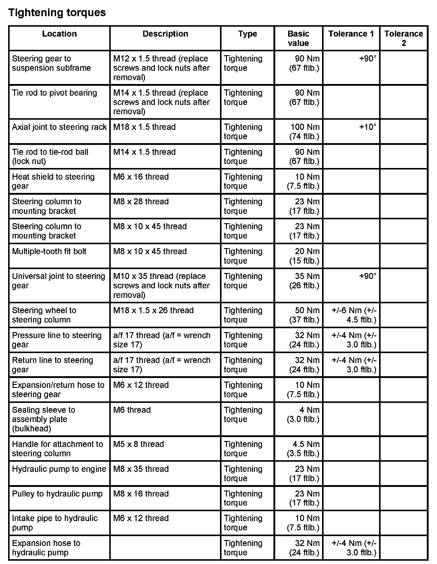 Tightening torques for