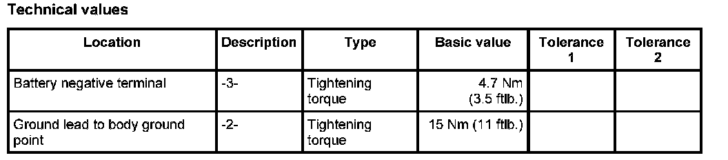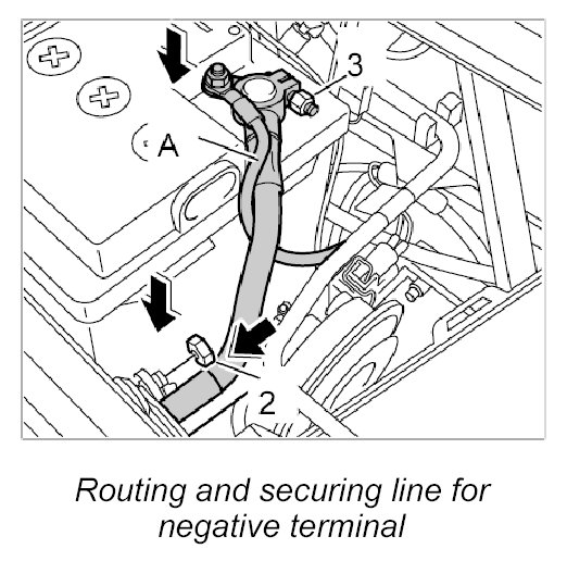 5. Position line for the negative terminal on the battery again and screw it on securely -3-. Tightening torque: 4.7 Nm (3.5 ftlb.)