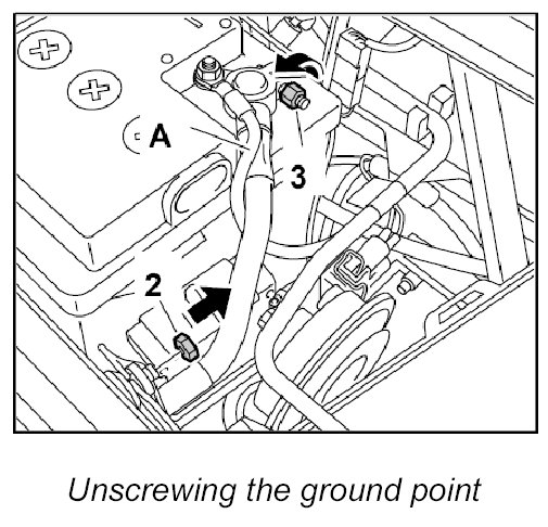 2. Unscrew the fastening nut -2- for the ground point on the body and disconnect the negative terminal -3- at the battery.