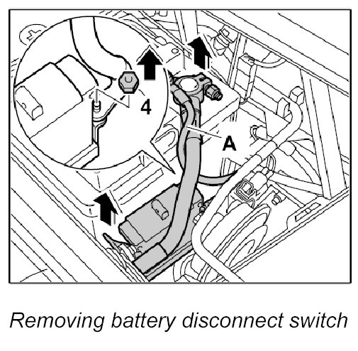 4. Remove battery disconnect switch together with the line for the negative terminal and screw off the fastening nut -4-. Remove line for the negative terminal.