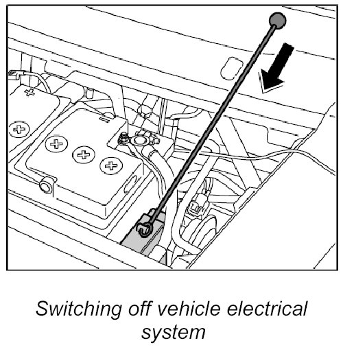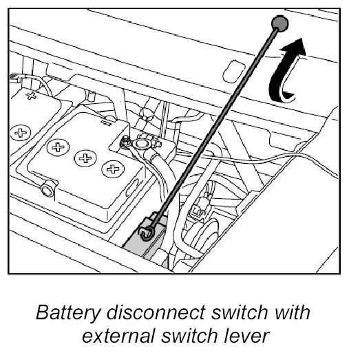 The battery disconnect switch, which is supplied via the positive terminal, is closed manually using the external switch lever and locked electromagnetically. The luggage compartment lid must not be open when doing this.