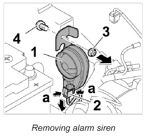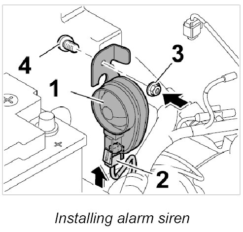 1. Position alarm siren -1-. Insert and counter fastening screw -4- and tighten fastening nut -3-. - Tightening torque: 20 Nm (15 ftlb.)