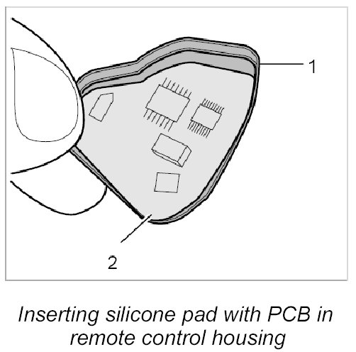 3. Insert silicone pad -1- with PCB into the remote control housing.