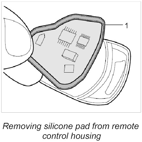 2. Remove silicone pad -1- with the printed circuit board (PCB) from the remote control housing.