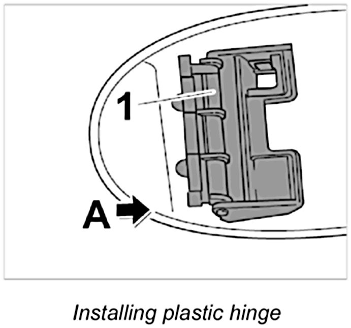 1. Position the plastic hinge -1- at the filler flap and push on in -direction of arrow A-. The lugs must engage perceptively.