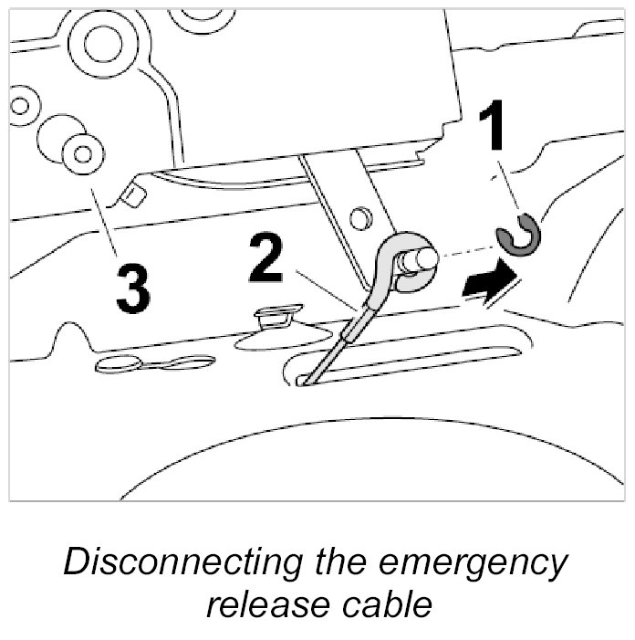 1. Press out circlip -1- and pull out emergency release cable -2- from lower part of lid lock -3-.
