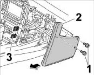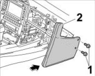 1. Unscrew fastening screws -1- and take off cover for centre console -2-.