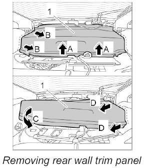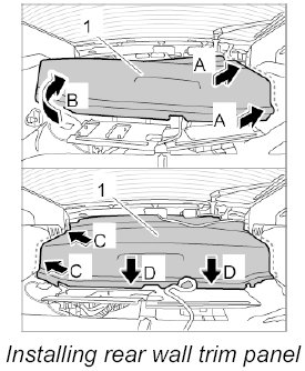 1. Position rear wall trim panel -1- sideways under the side trim panel at the left -Arrow A- and carefully guide it towards the rear -Arrow B-.