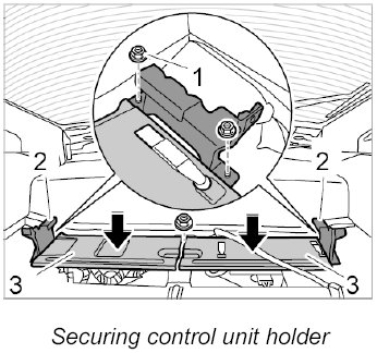 4. Position subwoofer holder -2- and tighten the fastening nuts -1-. Tightening torque: 6.5 Nm (5 ftlb.)