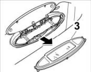 1. Insert a narrow plastic spatula between the mirror housing -2- and the sun visor -1- on the left and right and unclip the mirror housing.