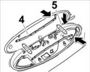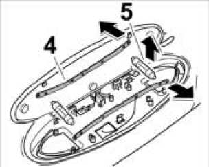 1. Position the contact clips -4- in the mirror housing and fit under the lug. Insert bulb -5-.