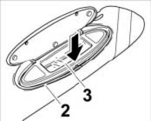 1. Insert electric lead into the mirror housing -2-. Position the mirror housing in the sun visor.