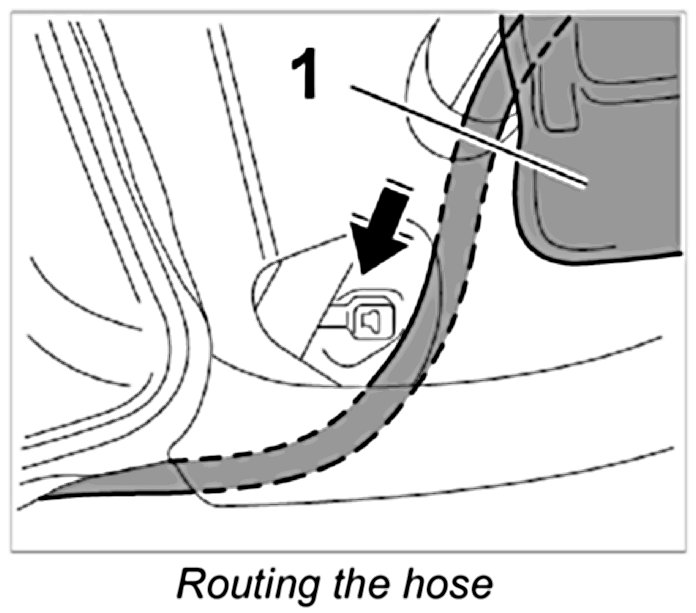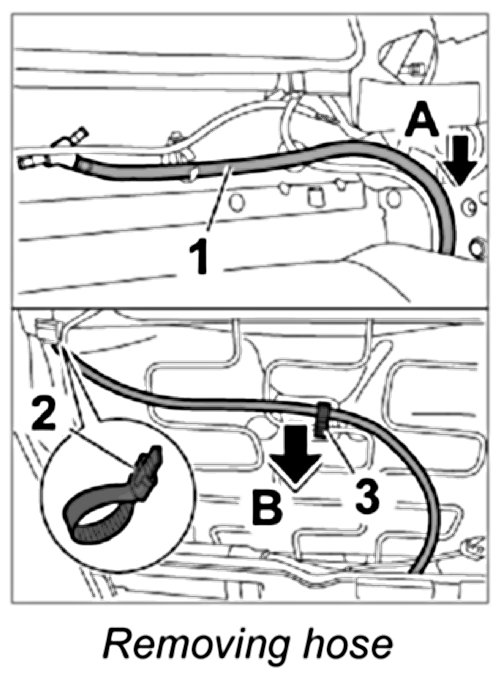 3. Pull the hose -1- through in an upward direction -arrow B- and secure with a new tie-wrap -2-.
