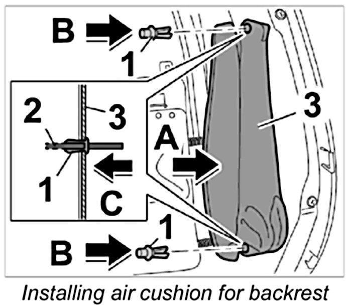 3. Secure the air cushion for backrest -3- with the two expanding clips -1- (-arrows B-). To do this, press the pins -2- into the expanding clips -1- (-arrow C-).