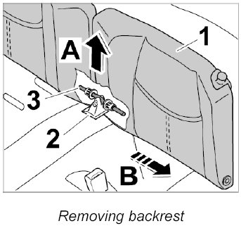5. Release backrest -1-, lift it out of the mounting saddle -2- (-arrow A-) and then pull it out of the bearing axle -3- (-arrow B-).