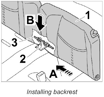 1. Insert backrest -1- into the bearing axle -3- (-arrow A-) and engage in the mounting saddle -2- (-arrow B-).