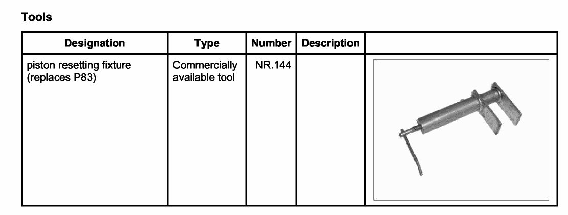 3. Push brake pads back slightly and evenly using piston resetting fixture (replaces P83) NR.144.