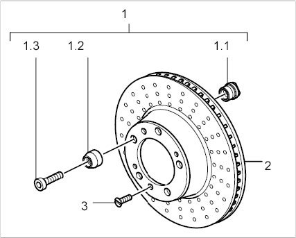 The wheel attachments -1- (5 x), comprising an attachment pin -1.1-, sleeve -1.2- and self-locking screw -1.3-, are only available as a set for one brake disc (Part No. 997.341.901.00).