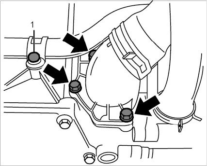 1. Remove two M6 fastening screws -1- for coolant line on crankcase. Unscrew three M6 screws on coolant regulator housing -arrow-.