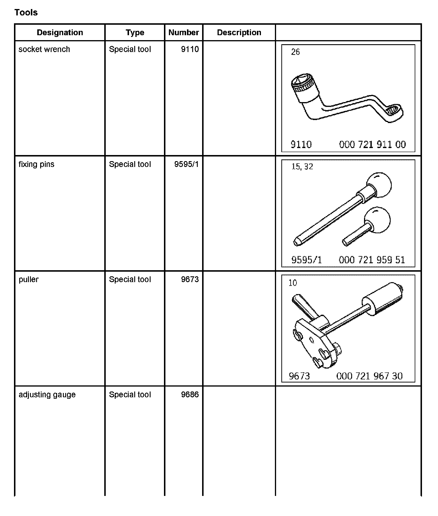 3. To check the camshaft adjustment, insert adjusting gauge 9686 for camshaft into the camshaft slots (pulley side) (inscription on gauge pointing towards cylinder head cover). If the gauge cannot be inserted, rotate the crankshaft a further 360° and secure it again.