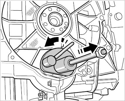 ^ Remove bearing cover using special tool puller 9673. If this is not available, lever the bearing cover out carefully with two screwdrivers so as not to damage the sealing surfaces. Turning several times to the left and right loosens the bearing cover.