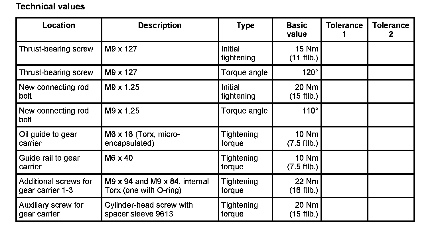 12. First, screw in connecting rod bolts to the required torque and tighten to the specified torque angle. Then loosen the bolts again. The final tightening is performed again with an initial tightening per the torque and the final tightening is performed with the torque angle wrench. -> Initial tightening: 20 Nm (15 ftlb.); -> Torque angle: 110°