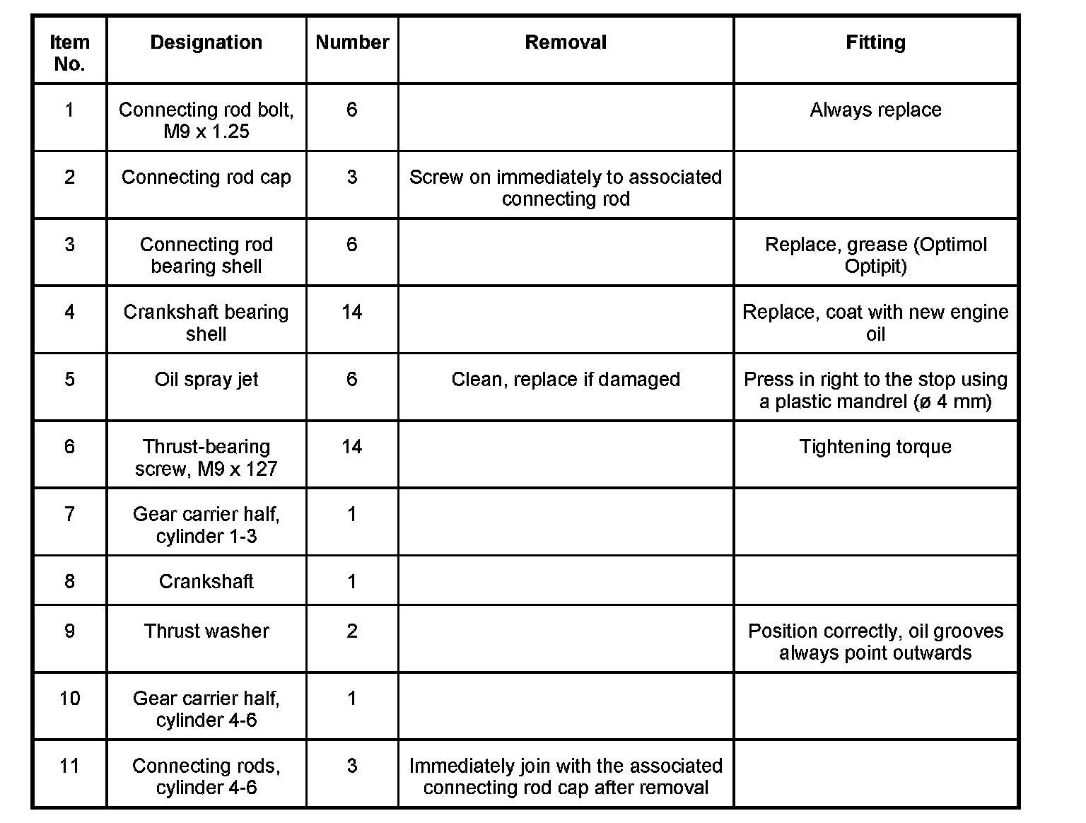 3. Remove connecting rods on cylinder side 4-6 one after another. Loosen the two connecting rod bolts on each connecting rod, remove connecting rod cap. Using a plastic mandrel (possibly an in-house tool) push connecting rod down and out. Immediately after this, screw on loosely to associated connecting rod cap. Place on a clean surface.