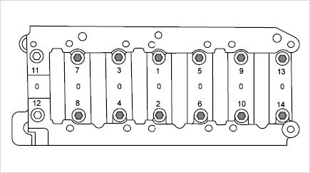 8. Position 14 M9 x 127 thrust-bearing screws manually. Pre-tighten screws to the required tightening torque in accordance with the tightening sequence. Then tighten to the required torque angle. -> Initial tightening: 15 Nm (11 ftlb.); -> Torque angle: 120°