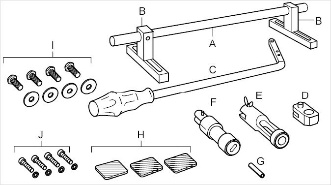 3. Align aluminum supports on the cylinder head with fastening screws. Fix cylinder head to the workbench with screw clamps. Slide on assembly shaft with the joint to the aluminum supports and fasten them.