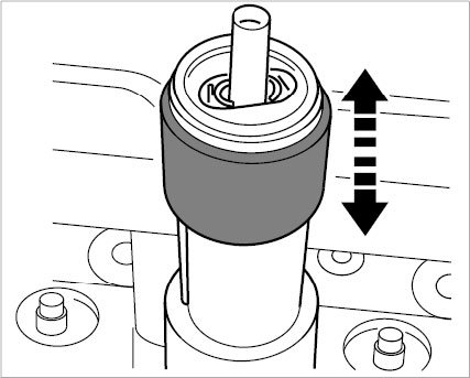 5. Position assembly head with the pressure piece over the valve stem and align the assembly head so that it is aligned with the valve. Slowly press the assembly head downwards and guide it with your hand until a clicking sound can be heard. The valve keys are then automatically pressed into the correct installation position.