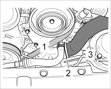 9. Loosen coolant hose in the engine compartment on the right -3-. Remove spring clamp -2- on Henn coupling and pull off hose.