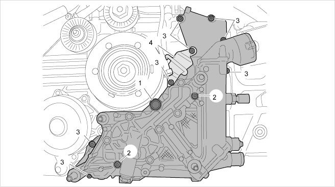 5. Remove oil pump with coolant guide housing. Also remove the drive belt guide -4- on Tiptronic vehicles.