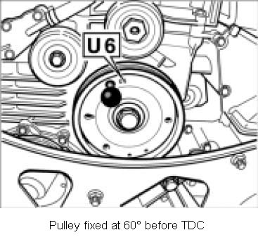 1. To remove the play from the timing chain drive, turn the crankshaft by means of the pulley or vibration balancer clockwise (running direction of engine to 60° before TDC : marking U6 on pulley or vibration balancer coincides with fixing bore in crankcase. Fix with locating pin 9595/ 1.