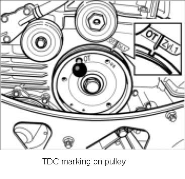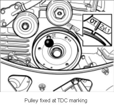 2. Disassembling cylinder bank 1 - 3 Turn crankshaft at the pulley/vibration balancer clockwise to the overlapping TDC of cylinder 1. Disassembling cylinder bank -6 Turn crankshaft to the TDC for cylinder. Using a locating pin 9595/ 1 fix the pulley or vibration balancer.