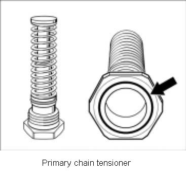 - Primary chain tensioner on crankcase (oil filter area), identification: one ring-arrow-