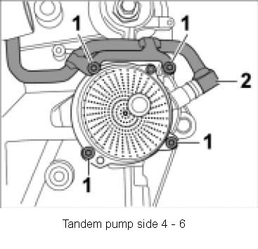 3. Fit oil suction pump (1 - 3) and tandem pump ( - 6) with new, micro-self-locking Torx screws M6. Replace O-rings and grease with Optimol MP3. - Tightening torque: 7.5 ft. lb.